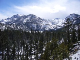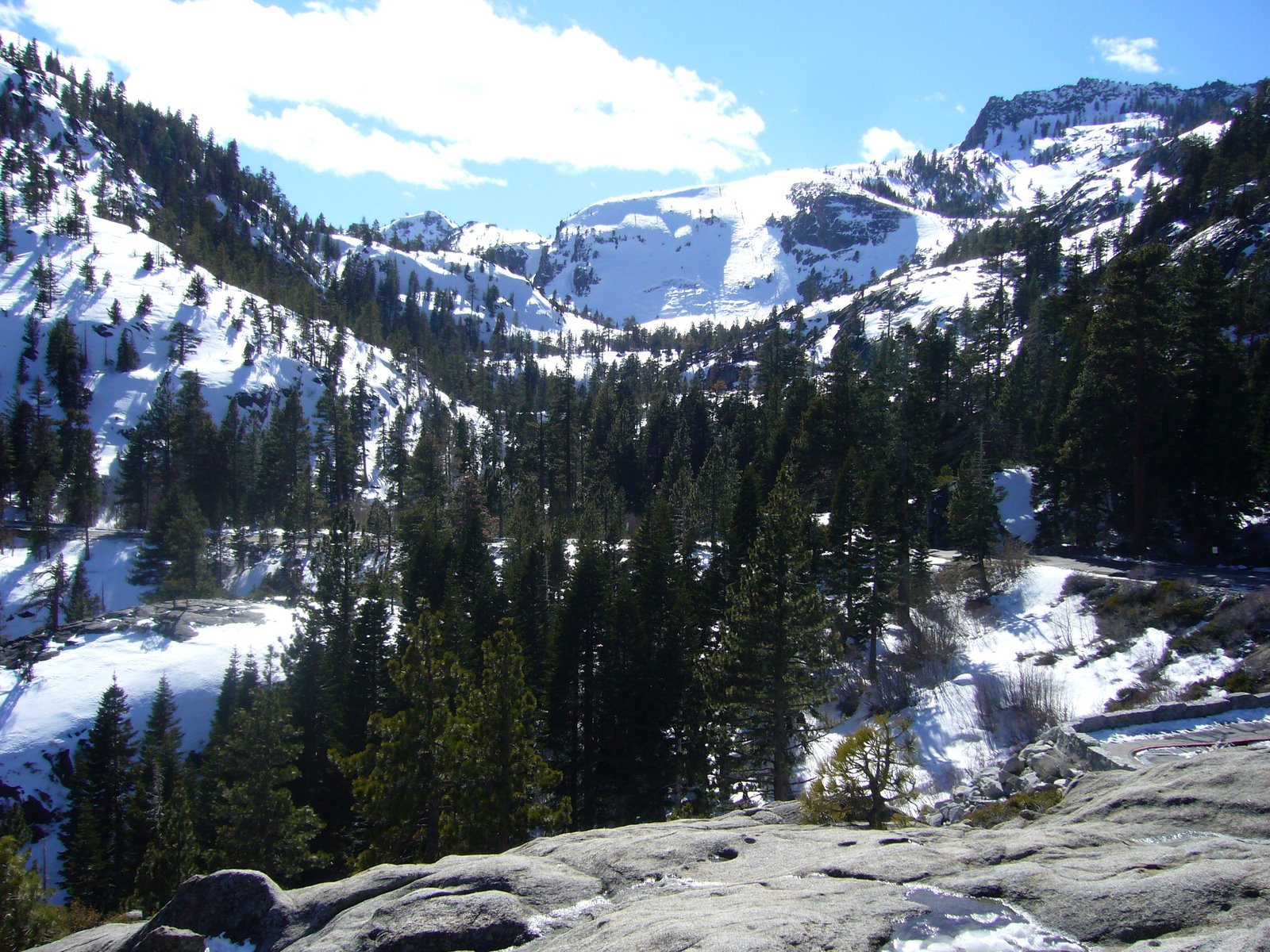 Lake Tahoe is a relatively young lake, forming within the last several million years (in contrast, the block of granite that was to become the Sierra Nevada mountains – and in which Lake Tahoe lies – began forming during the Paleozoic Era and was then exposed by erosion beginning about 130 million years ago). The basin in which the lake lies was formed by fault-induced block slippage between two uplifted blocks, with the lake itself forming after magma upwellings dammed the northern part of the basin. Glacial action in more recent years (2 million to 20,000 years ago) caused additional damming, causing drastic fluctuations in the lake level — maximum levels reached nearly 800 feet higher than present. The most recent glaciations (~10,000 years ago) carved out Donner Lake (just east of Lake Tahoe), Emerald Bay (above), and nearby Fallen Leaf Lake (below — the frozen lake surface can just be seen above the trees in the foreground).