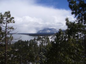 On the day we arrived (Sat 3/15), a late winter storm was dumping new snow on the surrounding mountains, as seen in this view across the south end of the lake towards the city of South Lake Tahoe. Heavenly Ski Resort was shrouded from view on this day, but the fresh powder being dumped there would provide for some delightful spring skiing over the next few days.