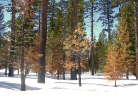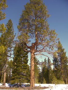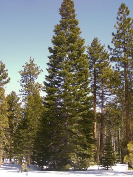 I had intended to photograph some of the conifers seen at higher elevations while skiing at Heavenly Ski Resort, but I decided not to bring my camera. Pity, as I not only saw nearly pure stands of what I presume to be red fir (Abies magnifica), but also beautifully twisted and wind-gnarled pines at the highest elevations (+10,000 ft) that probably represent whitebark pine (Pinus albicaulis), judging by their highly forked trunks and upswept limbs. These magically grotesque trees were made even more beautiful by the previous day’s storms, which had deposited thick cakes of ice on their windward sides.