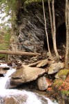 Presumed Chrysobothris dentipes adult emergence hole in exposed root of Virginia pine. Note pile of frass on the ground below the hole, suggesting that the adult emerged shortly before this photo was taken.